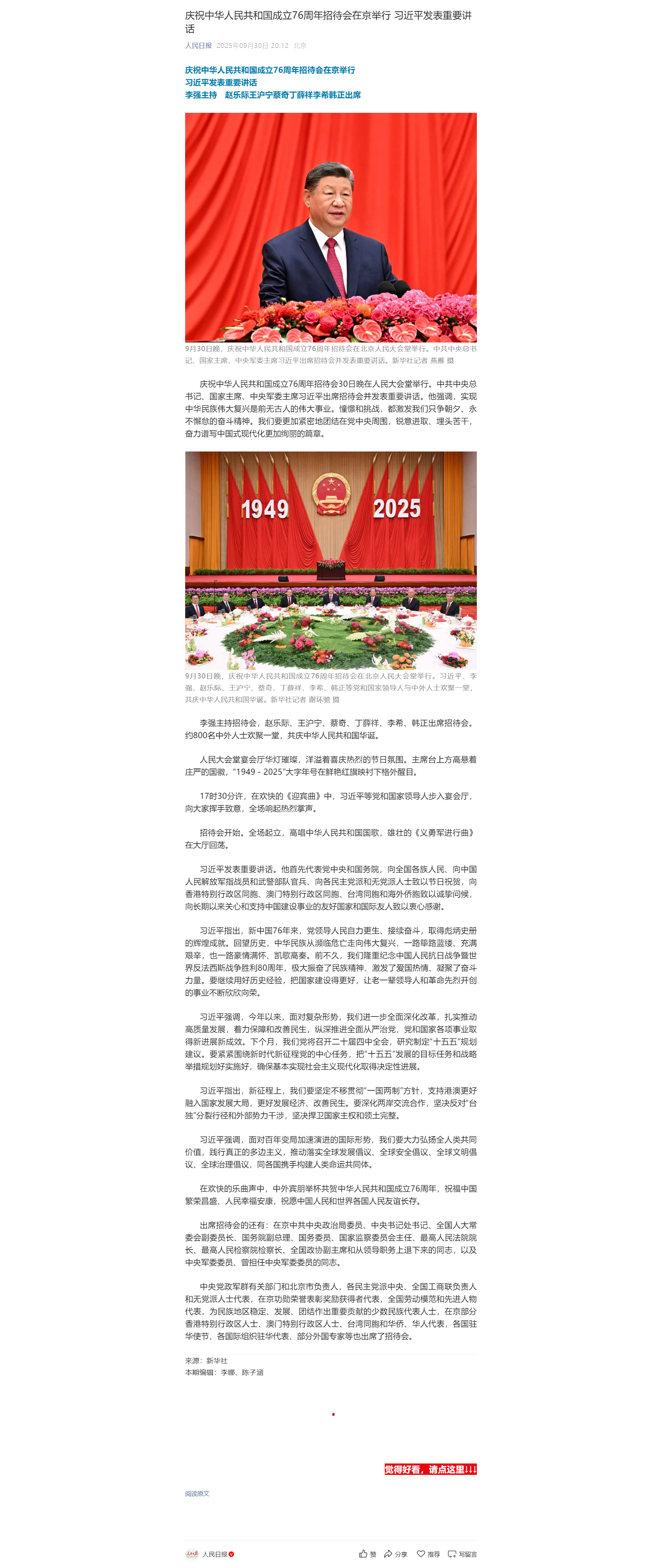 庆祝中华人民共和国成立76周年招待会在京举行 习近平发表重要讲话